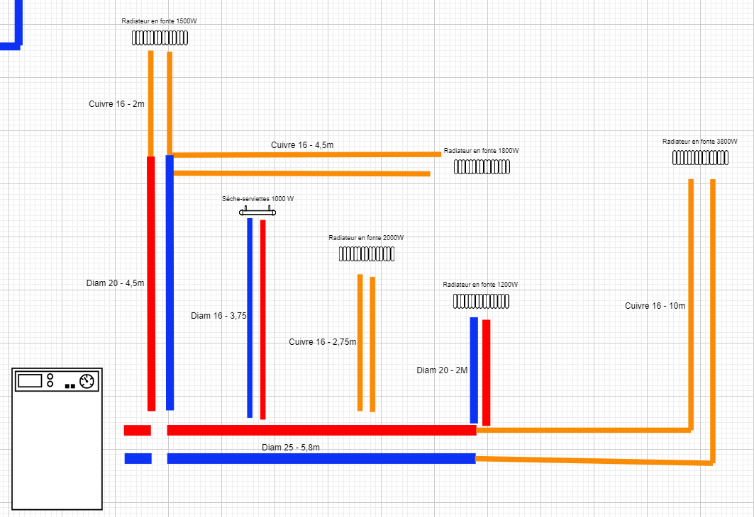Ainsi, par rapport à mon précédent schéma, je passerai en diamètre 25 le tuyau alimentant les deux radiateurs fonte de 1500w et 1800w afin d’être cohérent sur l’ensemble de l’installation (enfin je le pense