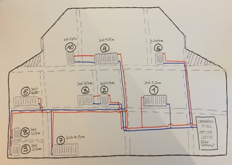 Je joins un schéma de mon installation, le radiateur en cause est le n°7 et j’ai effectué un désembouage de l’installation il y a une semaine, vue la couleur de l’eau le produit SENTINEL x400 fait son effet mais je vais suivre vos conseils et démonter le radiateur pour le rincer abondement jusqu’à obtention d’eau claire.Je vais en profiter pour purger l’arrivée et le retour on sait jamais, peut-être que l’air se balade entre radiateur et tuyaux d’arrivée