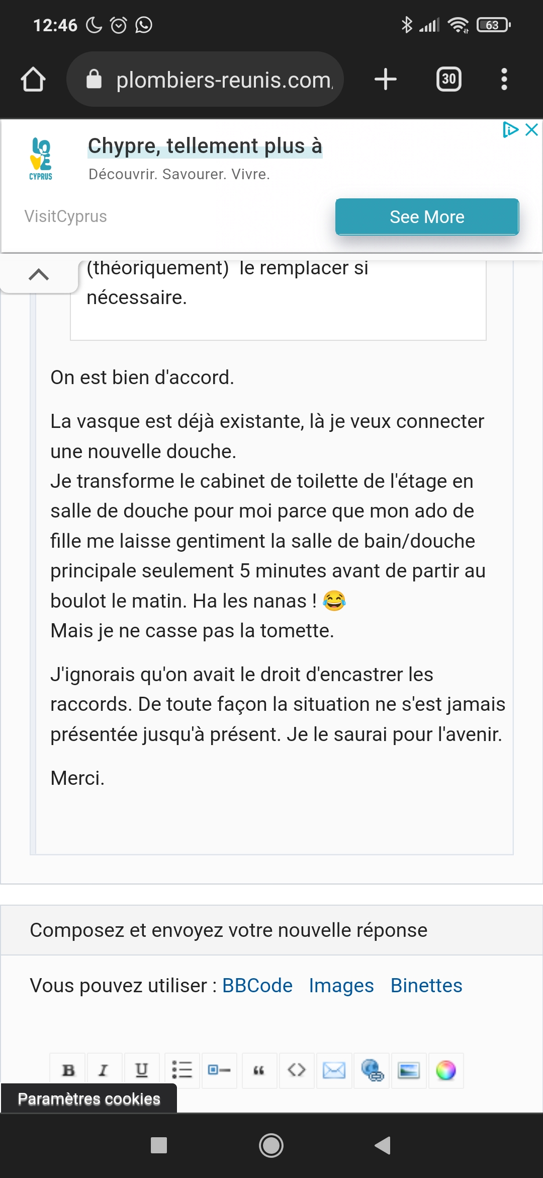 Je transforme le cabinet de toilette de l’étage en salle de douche pour moi parce que mon ado de fille me laisse gentiment la salle de bain/douche principale seulement 5 minutes avant de partir au boulot le matin. Ha les nanas !nico22 wrote:c’est de la rénovation donc il faut jongler avec les normes et les contraintes