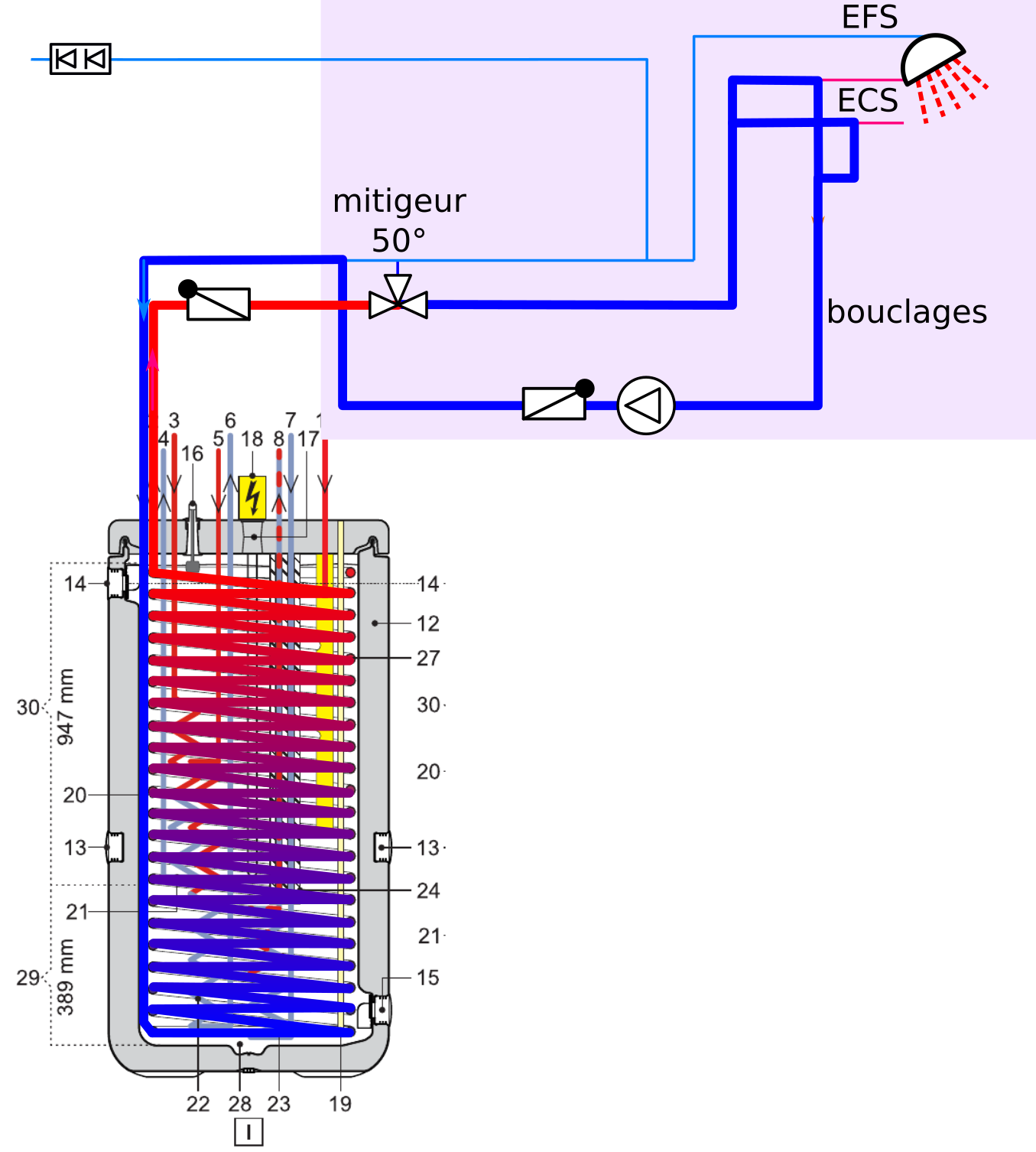 De l’eau chaude entre dans la boucle depuis le mitigeur et avance vers le circulateur. - étape 2, le départ ECS est chaud mais le retour bouclage est tiède, de l’eau tiède entre par le bas du ballon et abîme la stratification le temps que la boucle soit chaude. J’espère que ce n’est pas long.