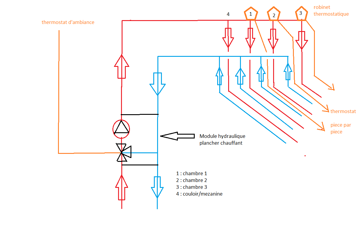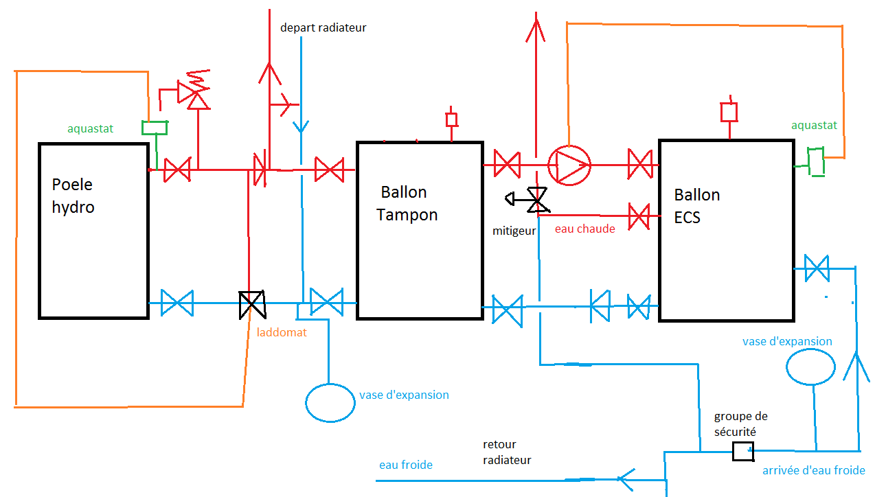 j’ai mis un module sur mon schéma mais si j’ai bien compris il faudrai un ballon tampon pour que le plancher chauffant puisse chauffer en permanence …. ou que le poêle tourne en permanence lol , je vais rester sur des radiateurs partout et la chaleur se diffusera plus vite….. merci