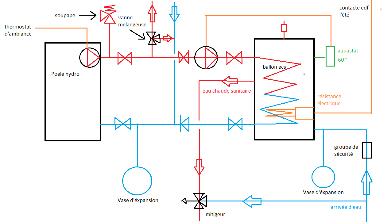 oui je sais , je pense partir avec une pompe pour l’ecs ou vannes de zone lequel est le mieux ? je mettrai un circulateur je pense branché avec un aquastat sur le ballon ecs pour la partit chauffage, et la résistance du ballon avec le thermostat branché sur la partie edf contacteur jour/nuit, vous en pensez quoi?