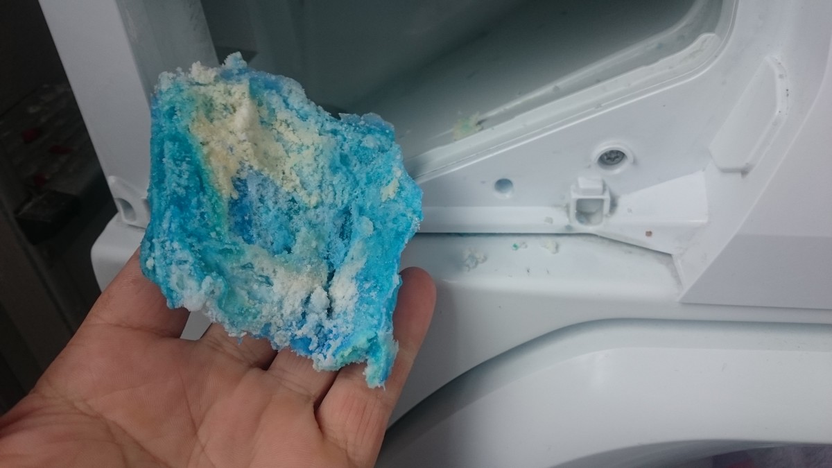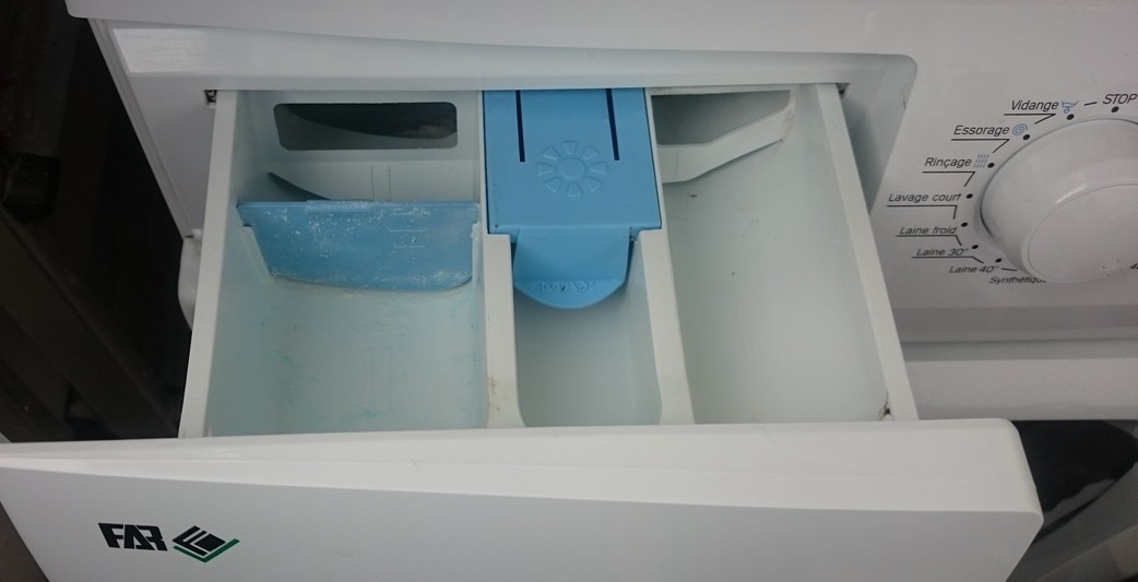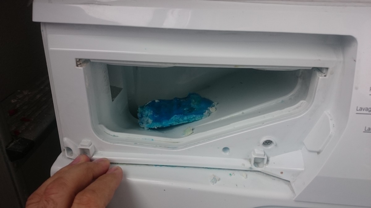 Une fois le tiroir enlevé voici ce que j’ai trouvé dedans. « des résidus de lessive et d’adoucisseur ».