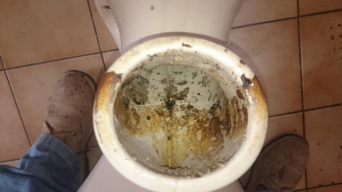 J’avoue que j’ai déjà vu de toutes les couleurs dans ma carrière professionnelle, mais la ça dépasse tous ce que j’ai pu rencontrer. Voici le toilette démonté et penché vers l’avant la photo a été prise par la sortie de la cuvette.