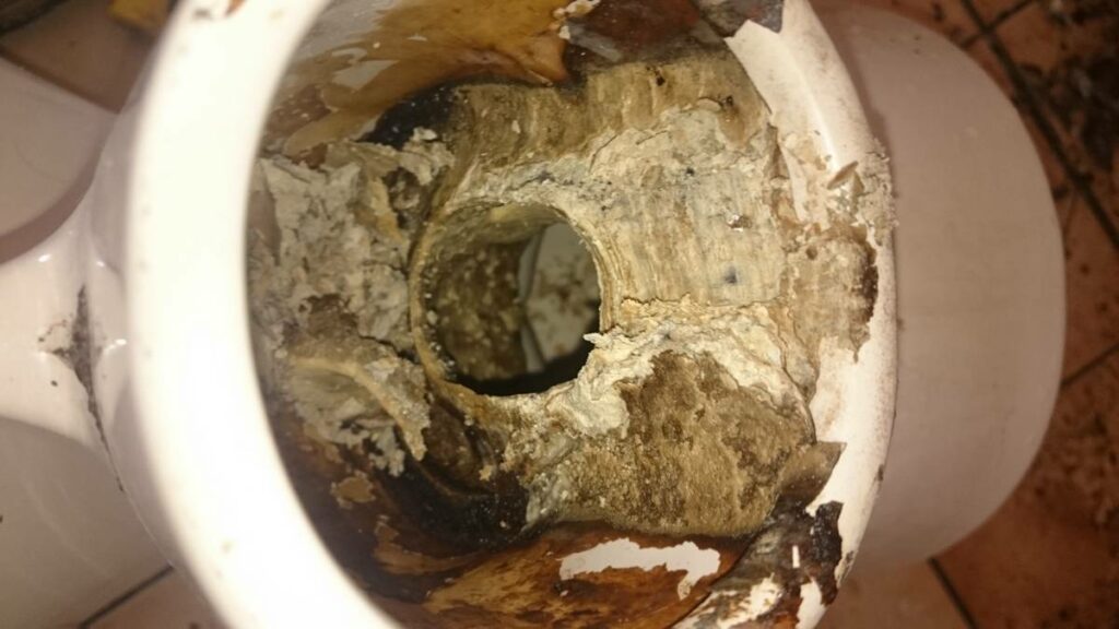Généralement ce type d’entartrage se trouve dans la canalisation assez proche du cabinet de toilettes.