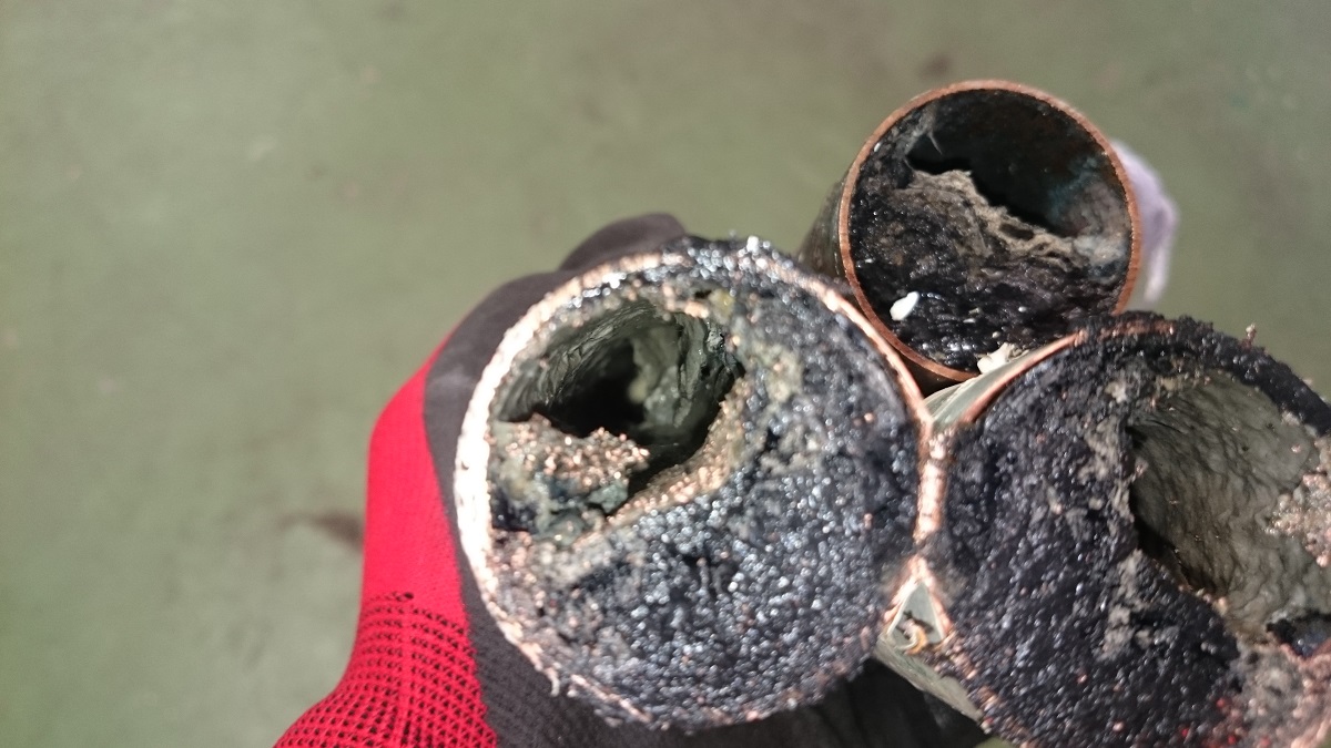 Dans l’image suivante, on trouve une canalisation obstrué a 80%, on note que les dépôts se sont déposés par couches et se sont cristallisés suite a l’utilisation des produits chimiques, qui ont seulement aggravé la situation. Dans ce genre de cas même le furet ne gratte pas l’intérieur des canalisations, la seule solution est le remplacement.