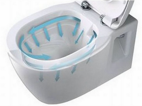 Il faut savoir que les cuvettes a bride qui équipent nos cabinets d’aisances depuis des décennies, ne sont pas les plus hygiéniques, bon nombre de bactéries vient souvent se loger a cet endroit, pour supprimer la bride il est alors nécessaire de revoir tout le concept et en particulier le systeme de projection de l’eau.