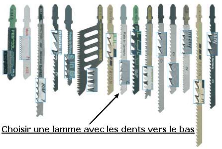 Selon le bois a couper et l’épaisseur du plain il faut choisir une lame en conséquence plus le bois est ferme et épais plus les dents de la lame doivent être gros. Choisissez une lame avec dentelure inversé (dents vers le bas) autrement le plan risque d’être écaillé lors de la coupe…