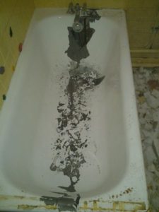 Comme vous pouvez les constater il n’est pas aussi difficile de casser une baignoire, il suffit de taper aux bons endroits et même avec un petit marteau la baignoire se fendra sur toute la longueur en suivants les coups de marteau.