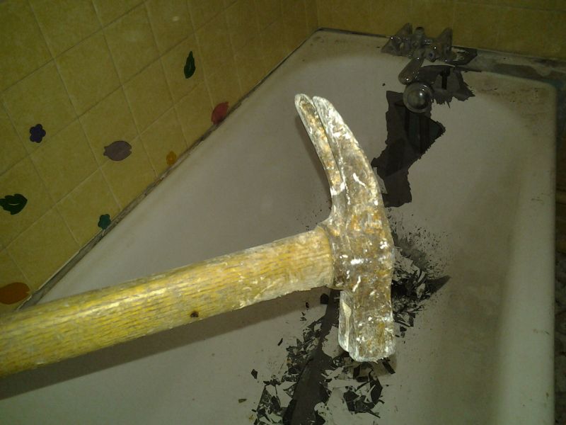 Et voila mes armes de destruction massive, en ce qui concerne les baignoires, « un marteau de charpentier » ou une massette, taper tout au long de la baignoire de l’intérieur vers l’extérieur.