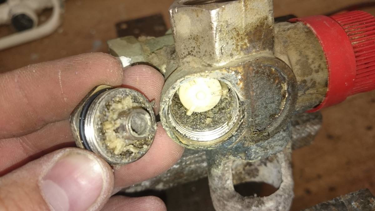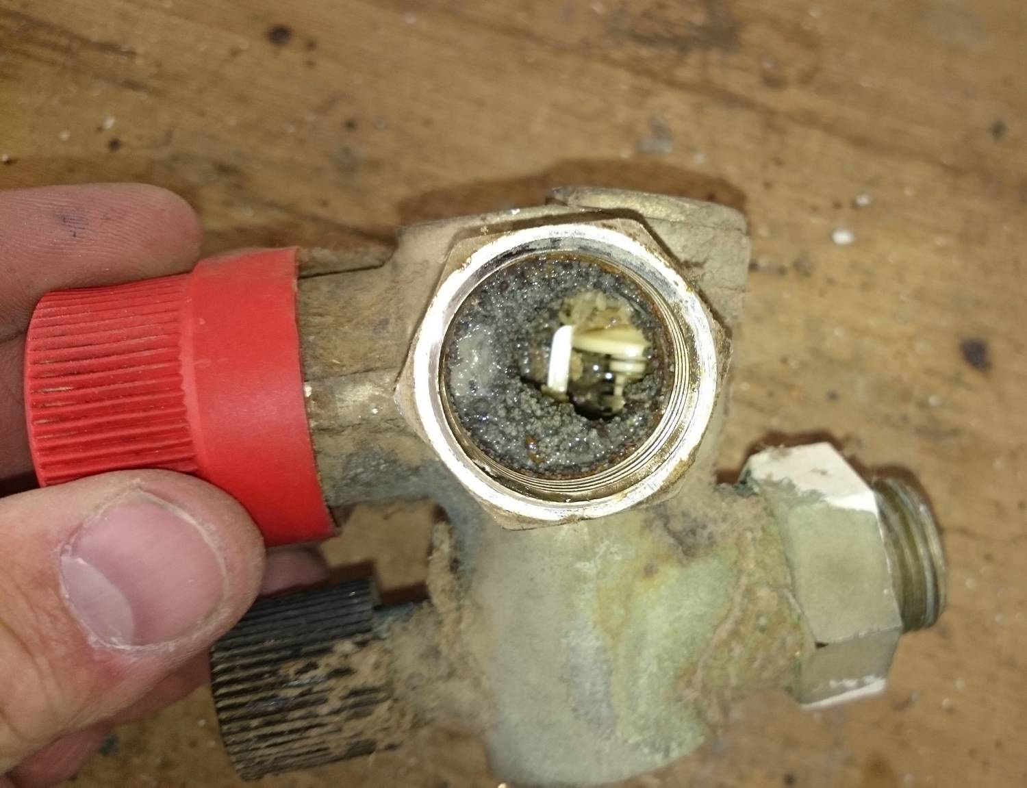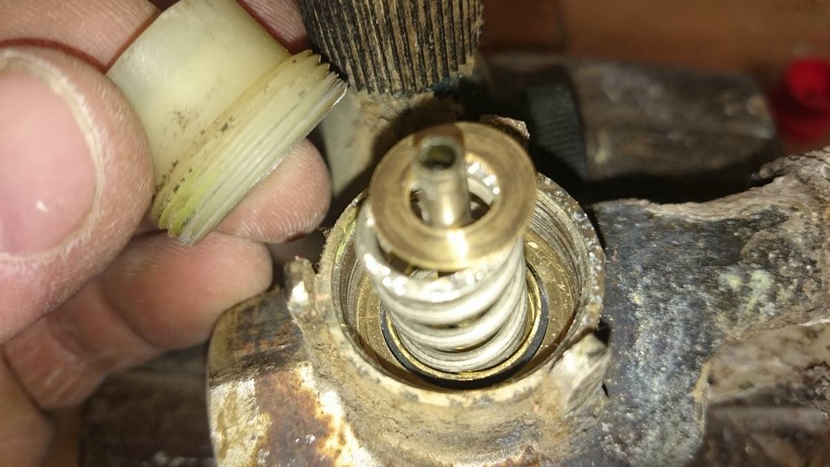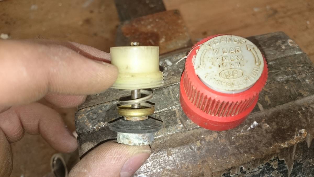C’est le moment de démonter aussi la soupape de sécurité en dévissant le corps de maintien de la soupape, qui se trouve être en plastique comme on peut constater sur l’image.