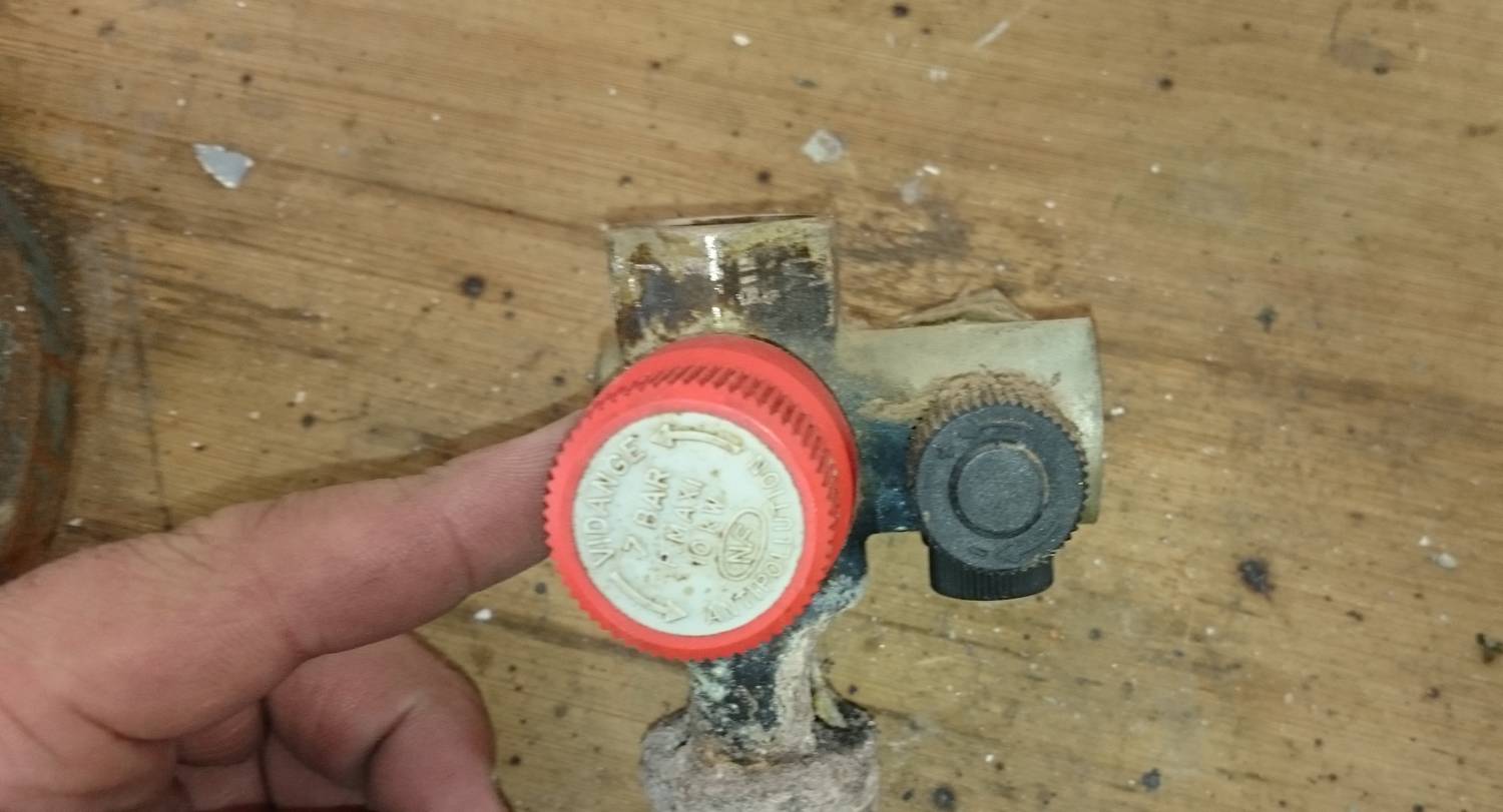 La fonction vidange est assuré par l’ouverture de la soupape de sécurité, des pitons sur le corps du groupe permettent a la molette rouge de faire remonter la soupape de securité en tirant sur l’axe du clapet.