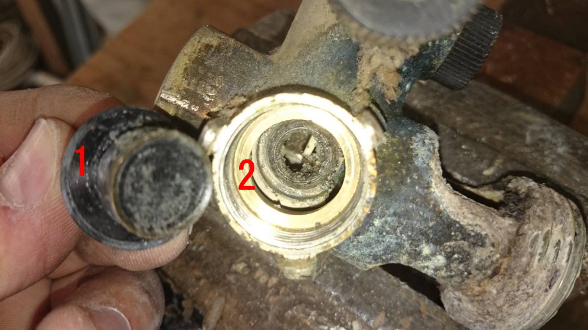 Et enfin on voit le fameux groupe vu a l’intérieur, c’est cette partie qui nous intéresse, je suis stupéfait de trouver autant de saleté dedans. On aperçois le ressorts du clapet anti-retour, une des fonctions clés du groupe de sécurité.