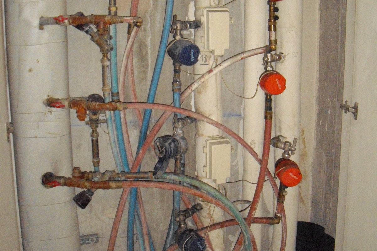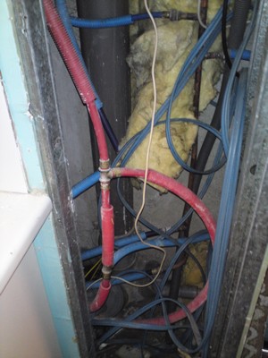 Lors d’une intervention pour réparation de fuite, voici ce que j’ai trouvé. On note bien, sur le coté gauche, le chauffage avec des tuyaux destinés a l’eau sanitaire et sur la droite les colonnes munies de compteurs eau chaude et eau froide, on ne note aucune différence entre les tuyaux alors que les tuyaux  pour le chauffage doivent être tuyaux  PER  BAO.