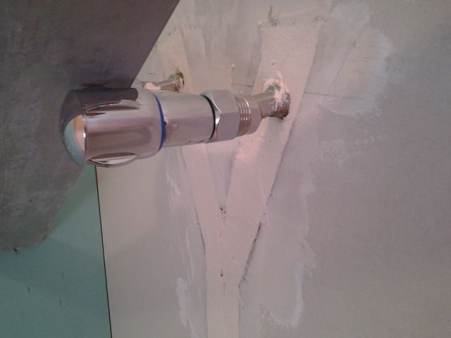 Puis enfin, finir le rebouchage, au besoin il est possible de placer une cale de manière a maintenir les sorties déjà préparés et bien en place, d’ailleurs on note sur cette dernière image que j’utilise une règle de manière a maintenir le robinet bien a sa place.