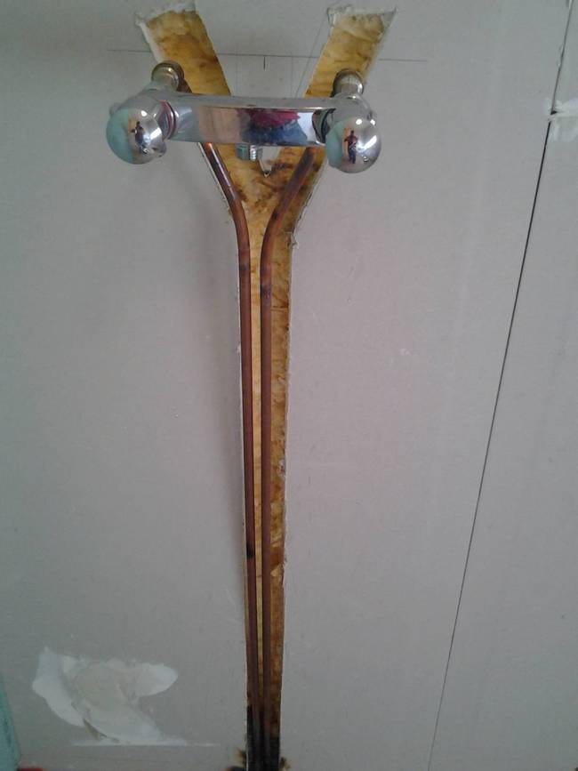 Bien qu’il soit interdit de passer les tuyaux dans l’épaisseur de l’isolation, il faut bien remonter le tuyaux jusqu’aux robinets en particulier sur les douches: