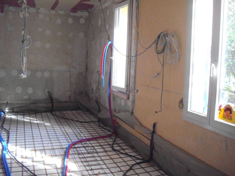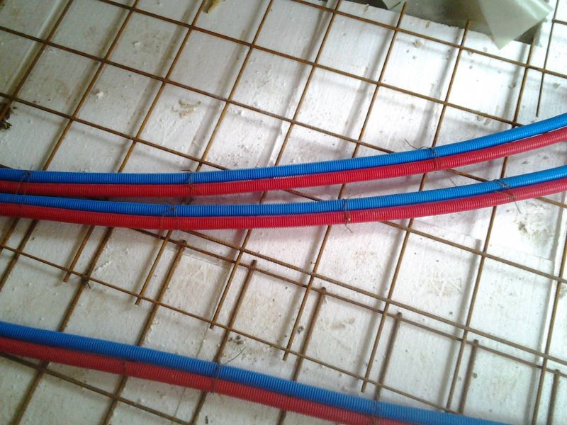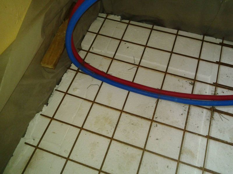 Dans ce cas précis, les tuyaux sont directement noyés dans le béton, or il y a une isolation sous le béton, donc dans le futur il y aura un ragréage avant la pose du sol finis, mais pas de chape, ceci est un point a surveiller afin que les tuyaux soient en zone chauffé.