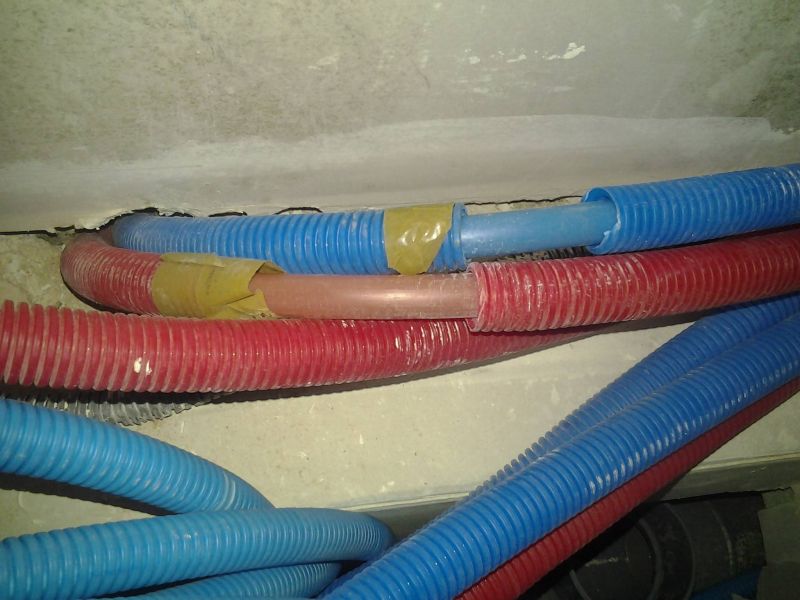 Nous n’avons pas respecté les couleurs, nous avons utilisé des tuyaux de Ø12 et de Ø20 bleus dans les lignes chaudes et froides, seuls les tuyaux per de Ø16 on été utilisés avec les deux couleurs, ce qui peut porter la confusion sur les images.