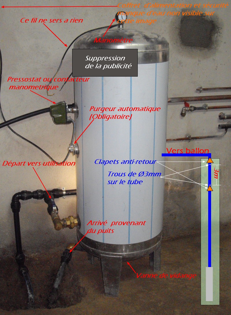 Dans ce cas précis, ce ballon est installé avec une pompe immergé dans un puits, donc il est très simple d’injecter l’air nécessaire au ballon comme on peut le constater dans le petit schéma a droite de l’image « les trous de Ø3mm« .