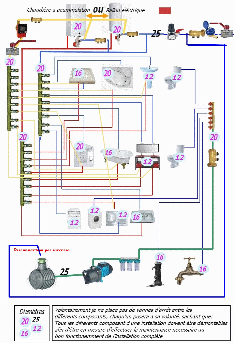 Ici nous avons dessiné un schéma qui peut servir de modèle pour toute installation de plomberie sanitaire.