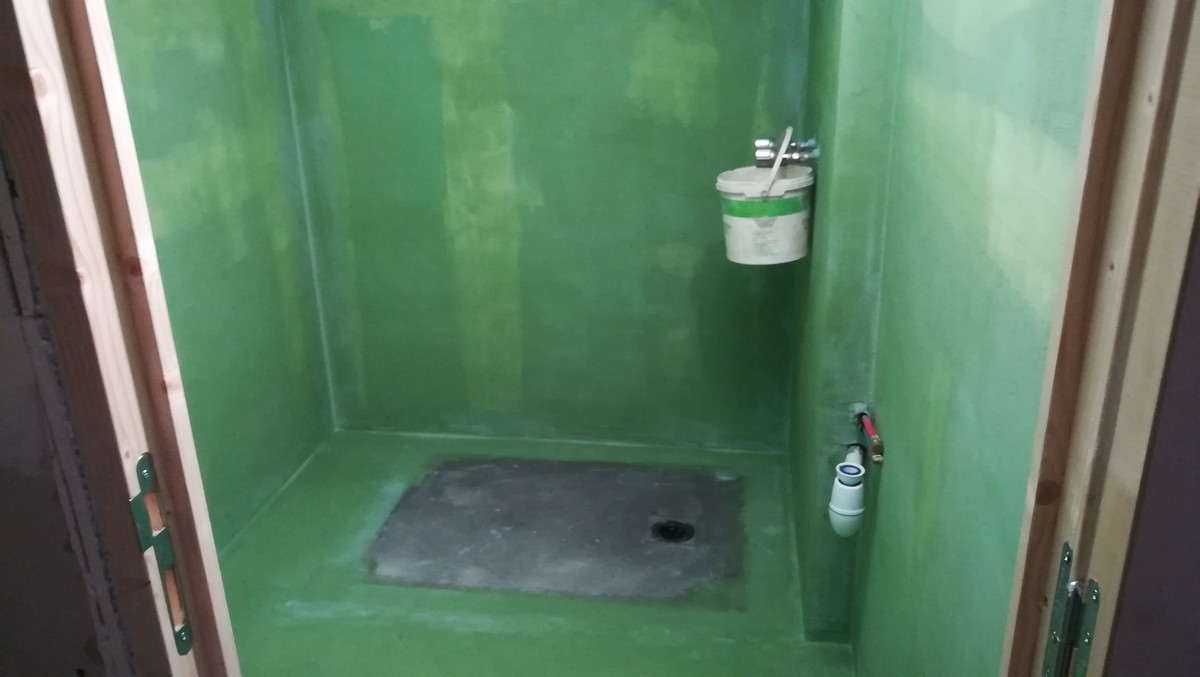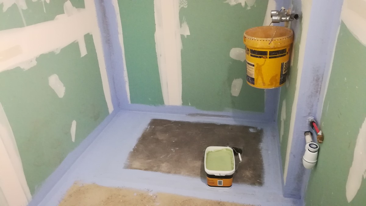 Puis un des points les plus importants consiste a passer deux couches d’imperméabilisation sous carrelage, pour ma part je me suis contenté d’un produit bas de gamme de chez LM, mais je conseille tout de même l’utilisation d’un produit de grande marque a la place des produits grand public.