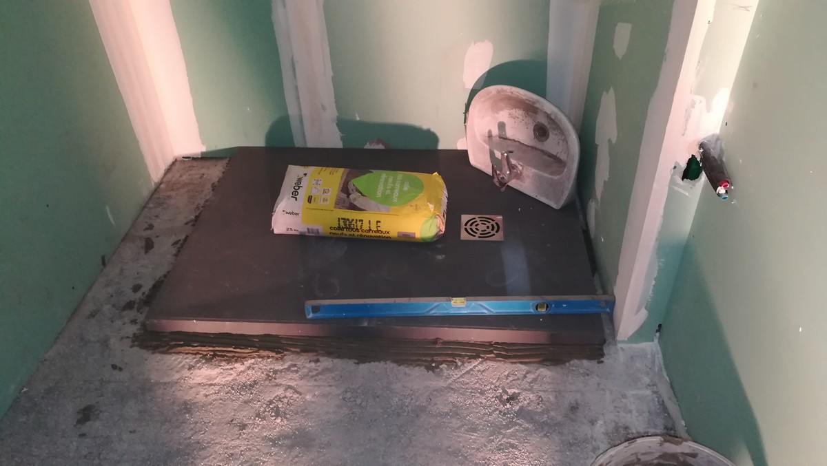 Avant d’aller plus loin je me dois d’avertir que dans ce type de réalisations, la douche dépassera toujours le sol, il est techniquement impossible de poser une douche au niveau du sol fini sans découper au moins 5 cm dans l’épaisseur du plancher.