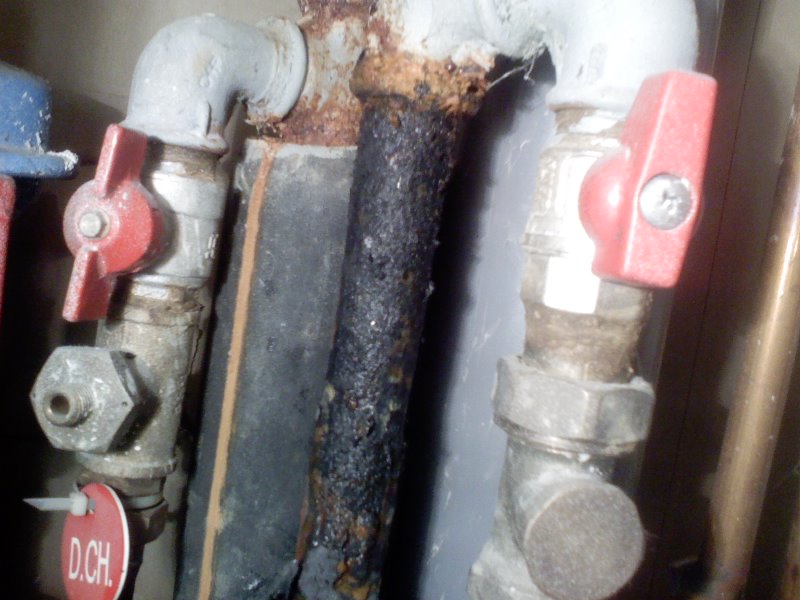 Dans ce cas ci dessus, vous trouvons un tuyau aussi bouffé par une mini-fuite qui provenait du purgeur automatique défectueux, sur une installations de chauffage, je précise que dans ce cas precis, il n’y avait aucun mélange de tuyaux, l’intégralité de l’installation, était réalisé en acier.
